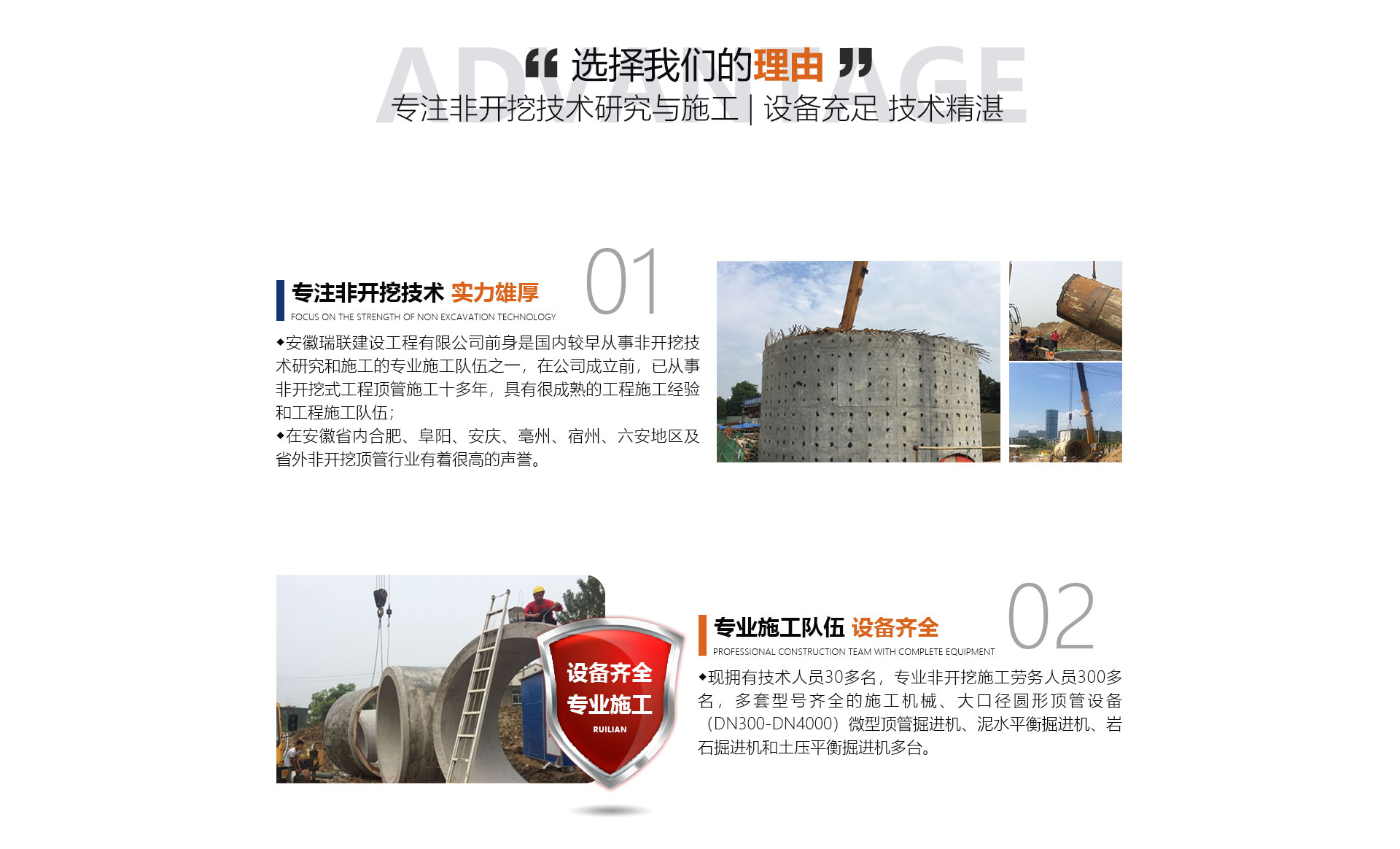安徽瑞聯建設工程有限公司前身是國內較早從事非開挖技術研究和施工的施工隊伍之一,在公司成立前,已從事非開挖式工程頂管施工十多年,具有很成熟的工程施工經驗和工程施工隊伍,在安徽省內合肥、阜陽、安慶、亳州、宿州、六安地區及省外非開挖頂管行業有著很高的聲譽。面對日益擴大的市場,公司于2014年正式成立,公司擁有勞務分包及市政公用工程總承包資質。公司優(yōu)勢(文字):現擁有中高技術人員30多名,非開挖施工勞務人員300...